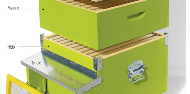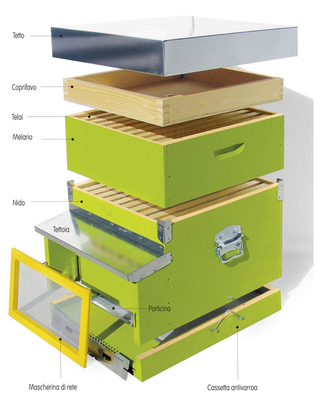 E’ divisa in due zone importanti. Il Nido che contiene 10 telai da nido dove le api si sviluppano aperto nella parte sopra e chiuso con una rete nella parte sotto. La zona melario che contine 9 telaini dove le api vanno a mettere le scorte di miele in eccesso. Il tutto è coperto da un coprifavo in legno  con un foro al centro utile per l’inserimento di nutritori, il tutto viene protetto da un tetto in lamiera zincata che protegge l’arnia dalle intemperie. Molto utile è la mascherina per la parte frontale che viene utilizzata quando dobbiamo trasportare l’arnia da una zona altra perchè sigilla l’uscita delle api. La porticina in metallo posizionata davanti alla zona di uscita delle api possiede due diverse seghettature: posizione esstiva con il massimo numero di uscite e posizione invernale con pochissime uscite.