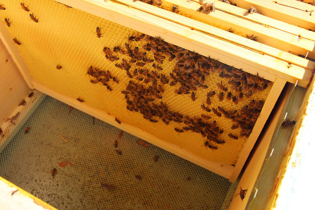 Ecco la foto dell’interno della zona nido con alcuni telai di covata con le api intente nella costruzione delle celle di cera. Si può vedere anche il fondo dove è posizionata una griglia. Sotto alla griglia abbiamo un fondo in lamiera removibile per la pulizia.